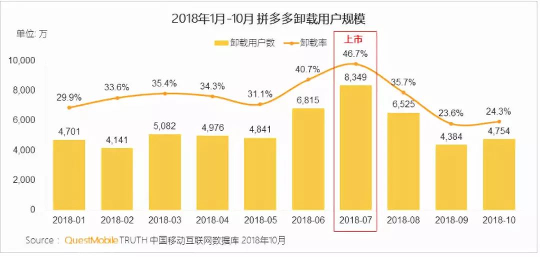 但其他电商平台的增长对拼多多来说不一定是好事,从QuestMobile的数据中可以看到,上市之后,拼多多新用户卸载率直接下降接近一半,目前过半用户与淘宝重合,与京东重合用户也暴增了4倍。