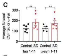 最后,研究人员又对小鼠进行了长期睡眠剥夺实验,他们希望了解,长时间不睡觉会对大脑中的Tau蛋白造成怎样的影响。结果显示,长时间缺乏睡眠会让小鼠脑中的Tau蛋白快速转移到多个脑区。