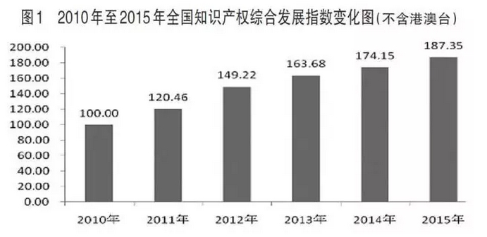 如图1所示,2010年以来,全国知识产权综合发展指数稳步上升,至2015年已达到187.35分,我国知识产权发展状况进入了一个全新的稳步发展阶段。