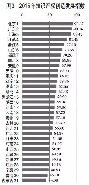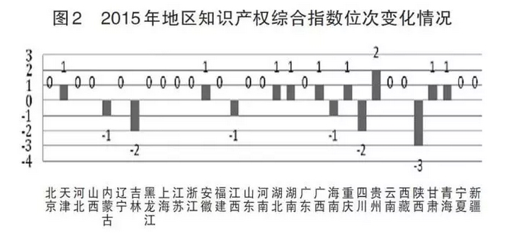 如图2所示,2015年地区知识产权综合发展指数位次并无显著变化,超半数地区位次未发生变化,位次提升较快的地区是贵州,名次上升了2位。地区间知识产权发展基本保持齐步向前的状态。