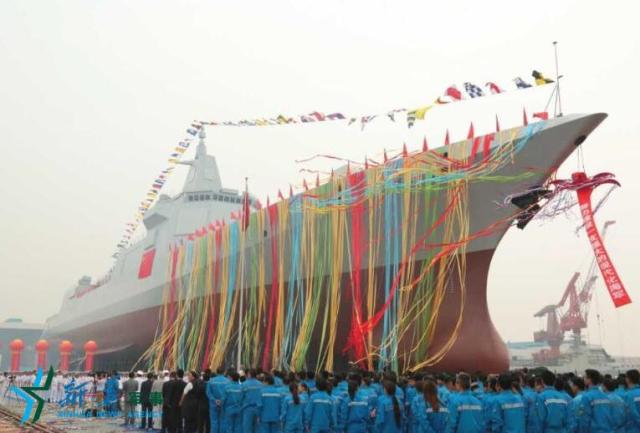 9时许,仪式开始,随着仪式现场全体人员齐声高唱的国歌声,鲜艳的五星红旗冉冉升起。剪彩后进行了“掷瓶礼”,一瓶香槟酒在舰艏摔碎,绚丽的彩带从两舷喷射而出,新型驱逐舰鸣响汽笛,全场响起热烈掌声。随后,驱逐舰在拖曳牵引下缓缓移上浮箱后下水。
