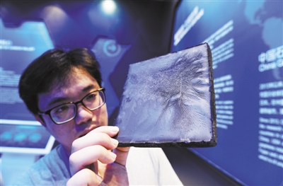 图为7月9日,科研人员展示石墨烯片粉末块。本报记者 周维海摄