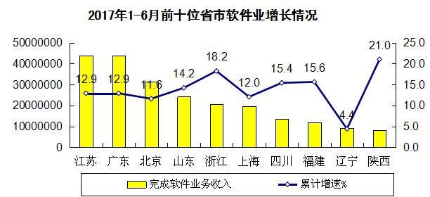 东部及东北地区增速低于全国平均水平,西部地区保持较快增长。上半年,东部地区完成软件业务收入20359亿元,占全国软件业务收入79.6%,同比增长13.3%,增速同比回落2.1个百分点,低于全国平均水平0.3个百分点;西部地区完成软件业务收入3000亿元,占全国软件业务收入的11.7%,增长17.7%,增速同比提高0.4个百分点,比一季度提高0.1个百分点;中部地区完成软件业务收入1098亿元,占全国软件业务收入的4.3%,增长16.5%,增速同比回落2.8个百分点,比一季度下降1.9个百分点;东北三省完成软件业务收入1127亿元,占全国软件业务收入的4.4%,增长5.7%,增速同比提高0.5个百分点,比一季度提高1个百分点。