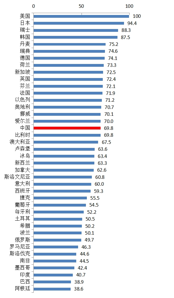 “金砖五国”除中国外,排名均在30名之后。俄罗斯列第33位,处于第三集团中的领先位置;南非、印度和巴西在40国中仍处于靠后的位置,分列第36、第38和第39位。