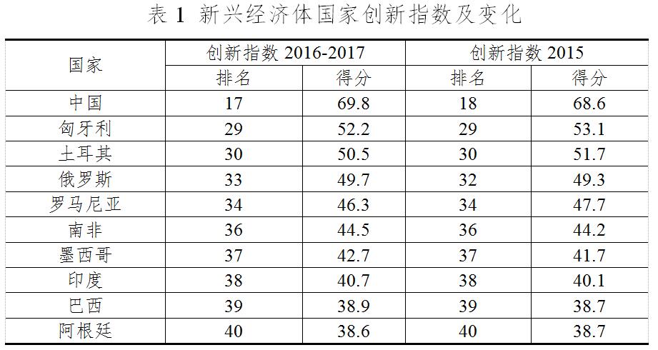 三、新兴经济体创新排名整体靠后,金砖国家排名稳定